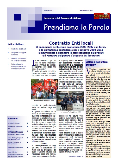 E' da oggi disponibile l'ultimo numero del nostro giornalino "Prendiamo la Parola" strumento di controinformazione per i lavoratori del comune di Milano. Se lo desideri puoi partecipare anche tu, mandaci i tuoi articoli.